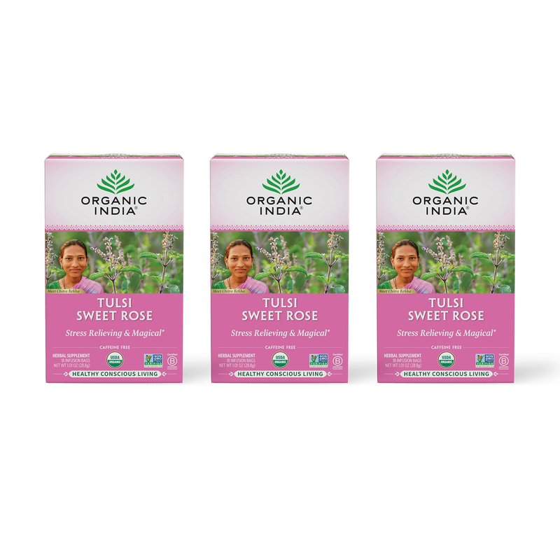 Organic India Tulsi Sweet Rose Herbal Tea - Holy Basil, Stress Relieving & Magical, Immune Support, Adaptogen, Vegan, USDA Certified Organic, Non-GMO, Caffeine-Free - 18 Infusion Bags, 3 Pack