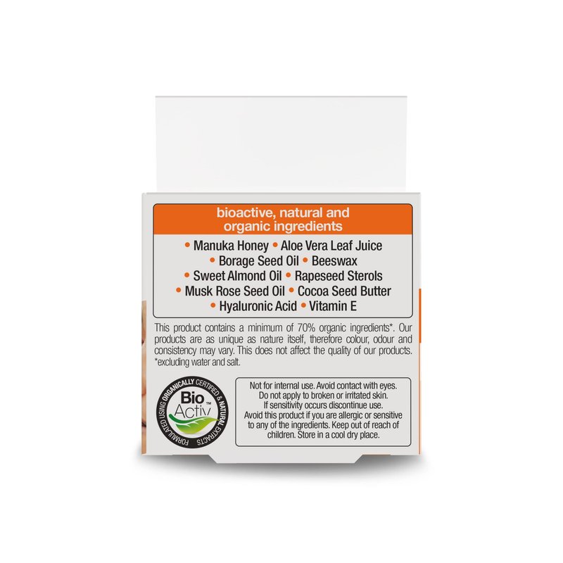 NATURAL - Intensive hypoallergenic emollient with moisture retaining formula to nourish, restore and soothe skin. ORGANIC MANUKA HONEY - Manuka honey’s purifying properties are what set it apart from traditional honey. Methylglyoxal is its active ingredient and is a property which can be rich in antioxidants, aiding the skin and hair with its purifying ability. CERTIFIED ORGANIC - by The Soil Association in compliance with the COSMOS-standard. We never use Parabens, Sodium lauryl sulphate (SLS), Synthetic colours, Mineral oil, DEA, BHT or Isothiazolinones. SUPPORTING PLANET ACTION - our products are in recycled and recyclable packaging and within FSC-certified card. Wherever possible, our packaging is made using ocean-bound recycled plastic. VEGETARIAN & CRUELTY-FREE - we do not test any of our products or raw materials on animals, and do not ask any third parties to test on our behalf.