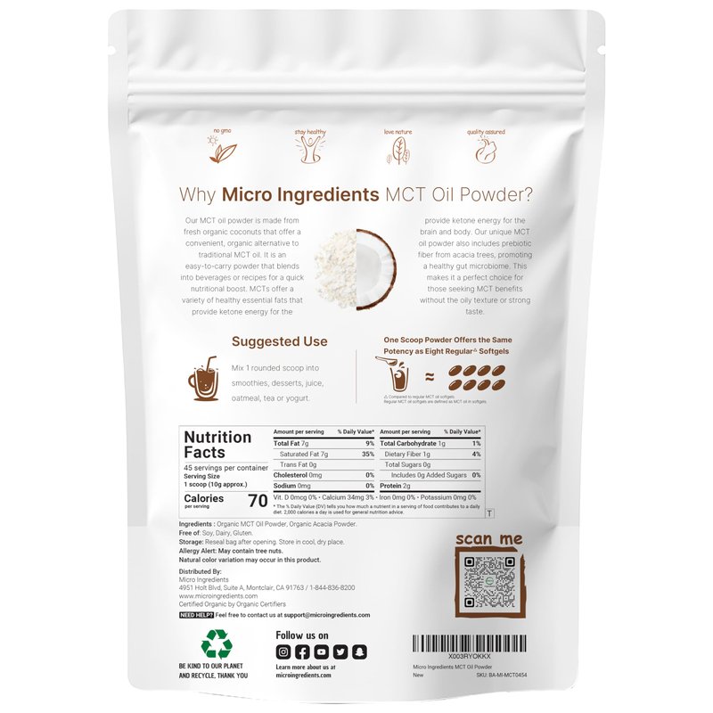 Micro Ingredients Organic MCT Oil Powder with Prebiotic Fiber,1 Pound(16 Ounce), Fast Fuel for Body and Brain, No GMOs, Keto Diet and Vegan Friendly, 70% C8 and 30% C10 Medium Chain Triglycerides From Organic Coconut, Keto Friendly