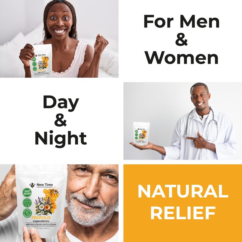 Experience natural relief and support with Propolis Suppositories For Men, a non-steroidal solution crafted for rectal healing. Designed to address conditions like hemorrhoids and anal fissures, this product combines potent ingredients such as propolis, black poplar bud extract, chamomile flower extract, calendula flower extract, and sage essential oil, all blended with nourishing beeswax and cocoa butter. Each suppository is formulated to soothe discomfort, reduce inflammation, and promote healing in sensitive areas, making it an effective choice for men seeking a natural and gentle approach to rectal health. These suppositories are made from high-quality, naturally sourced ingredients and adhere to the highest safety and quality standards, ensuring a clean and effective product free from harmful additives. Perfect for individuals who value organic health solutions, this product offers a reliable, soothing remedy for rectal discomfort.