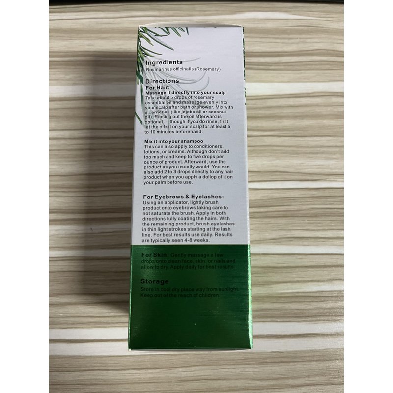 100% Pure Natural Rosemary Essential Oil for Hair, Eyebrow, Eyelash, Face, Skin Care, Body Massage and Aromatherapy. Features: 1.100% pure rosemary essential oil 2. Stimulates hair growth and reduces hair loss 3. Improves hair texture and moisturizes dry, flaky scalp 4. Stimulates eyebrow and eyelash growth, thicker, longer and fuller eyelashes and eyebrows 5. Softens and moisturizes dry skin, reducing the appearance of fine lines and wrinkles 6. Massage the body for relaxing Usage: 1.There is no right or wrong way to apply rosemary oil to your hair, some prefer the oil to be applied directly to the hair and skin/body or diluted into any cream, shampoo or conditioner per 100ml Just add 2-3 drops. Others like to use a scalp massager shampoo brush to massage rosemary oil into their scalp. 2.Add a few drops of rosemary oil at the palm of your hands and gently massage the product into your scalp or skin. It might take some time to coat each hair section, but the hydrating results will be worth. When you're done keep it on your hair until your next wash day. 3.There is no standard as far as how often you should use rosemary oil, but we'd recommend one to two times a week for at least three months, as that's typically how long before you'll see new hair coming in .It's important to keep in mind that hair growth doesn't happen overnight regardless of what products you're using. Package : 1x Rosemary essential oil 2.02 Fl Oz 1x Scalp Massager Shampoo Brush 1x Eyelash brushes 1x Eyebrow brushes Notes: 1.Although there are very rare cases of allergies, we would recommend to test the allergic reaction on the inside arm skin. 2.Keep it away from children. 3.Pregnant women don't use it please. 4.Please wash with water if it drops in eyes.