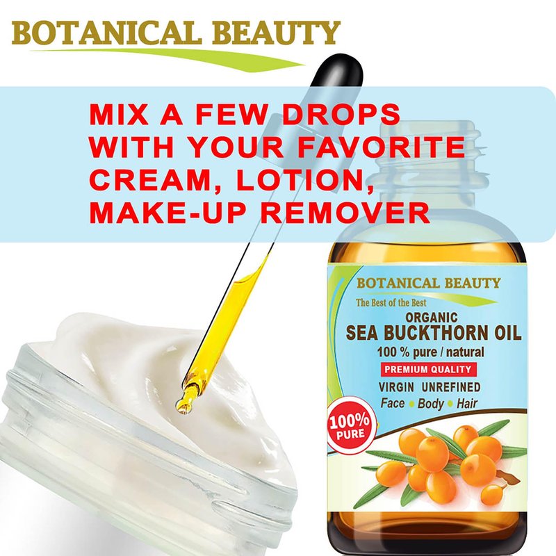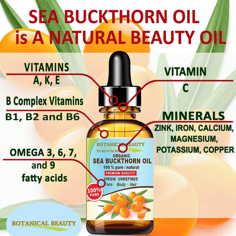 - BOTANICAL BEAUTY ORGANIC SEA BUCKTHORN OIL ( SEABUCKTHORN OIL or SEA BUCKTHORN SEED OIL) Hippophae rhamnoides is 100% PURE UNREFINED VIRGIN Cold-pressed RAW with no additives. SEA BUCKTHORN FRUITS, BERRIES and SEEDS are especially rich in vitamin A, vitamin C, vitamin K, and vitamin E, also contain considerable amounts of iron, calcium, magnesium, potassium, copper, and zinc, contains omega 3, omega 6, omega 7, and omega 9 fatty acids, such as gamma-linolenic acid (GLA) and B-complex vitamin B1, vitamin B2, B6