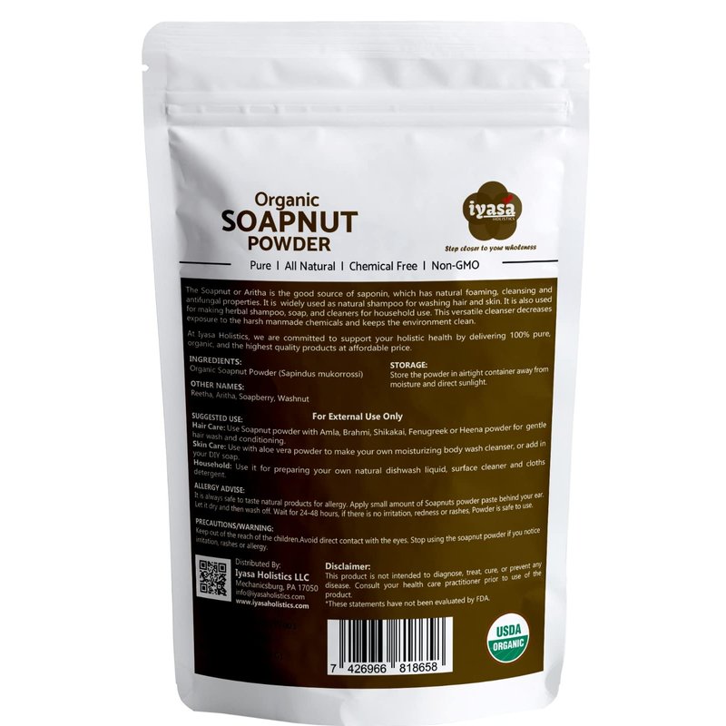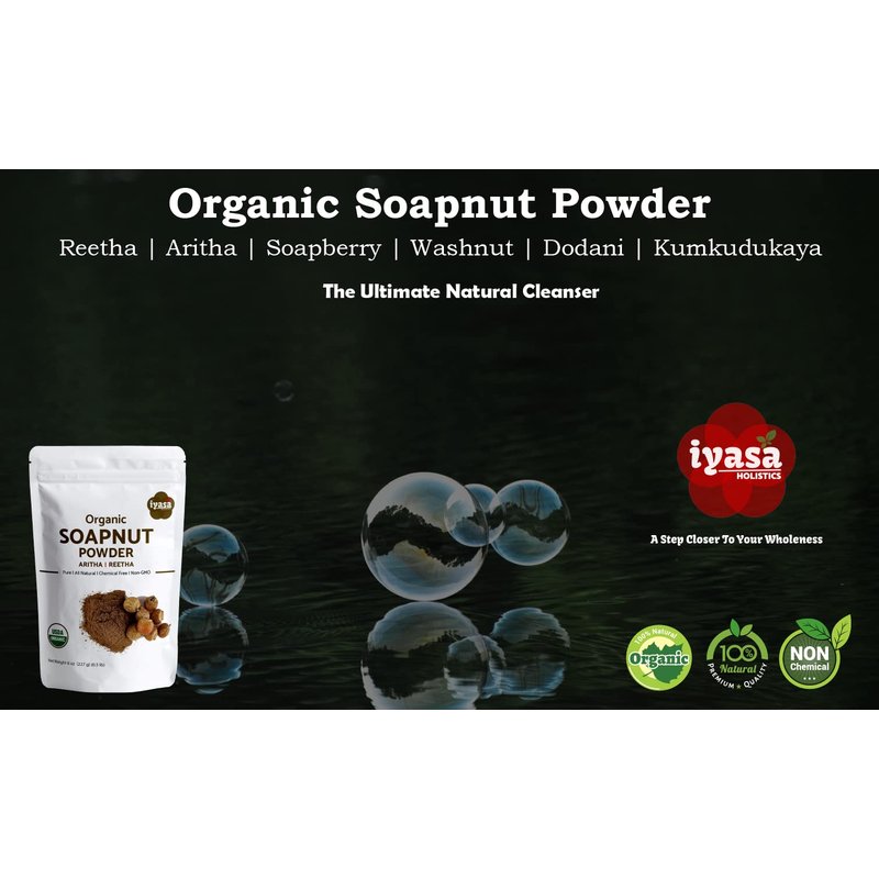 - 🍀Certified USDA Organic, Non- GMO: Iyasa Organic Soap Nut Powder is sourced from NOP (USDA) certified farms of India. It is Non-GMO, 100% Pure, Hypoallergenic, odorless (fragrance free), sustainable, gentle and versatile Natural cleaner for hair, skin, clothes, dishes and households.