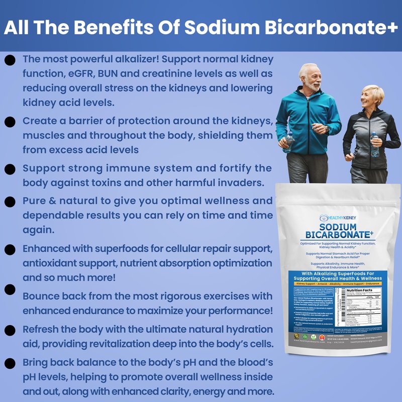 - End the acidity! Kidney Acid Gone! Stomach Acid Gone! Body Acid Gone! Alkalinity Remains! Nothing like Sodium Bicarbonate+ that delivers perfect alkalinity and pH balancing every time. Enjoy more foods without worries of stomach burn or rejuvenate your kidney health or alkalize your body for discomfort relief. Sodium Bicarbonate+ supplement gives hundreds of benefits with no negatives. An alkalizing supplement that can change your life.