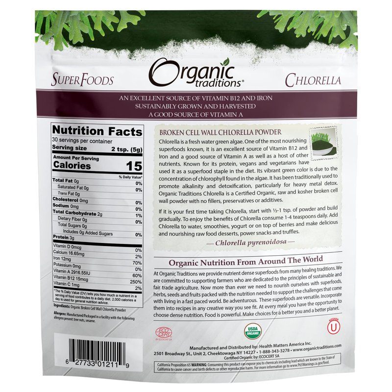 - Organic Traditions' Chlorella Powder is made from 100% organic chlorella, A fresh water green microalgae