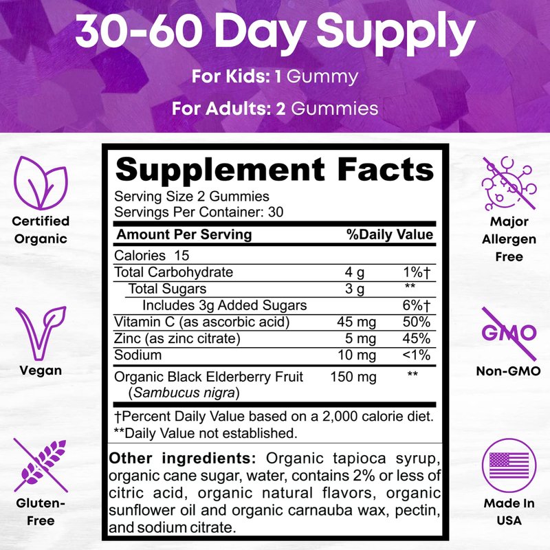 - Triple Action: Our Elderberry Gummies are formulated with Vitamin C and Zinc along with Organic Black Elderberry extract