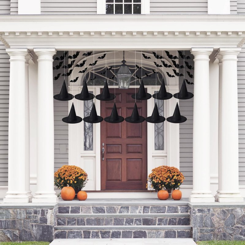 Orgrimmar 12 PCS Halloween Witch Hats with Hanging Pope, 32 3D PCS Bat Stickers for Halloween Party Decorations, Outdoor and Indoor Hanging Decorations