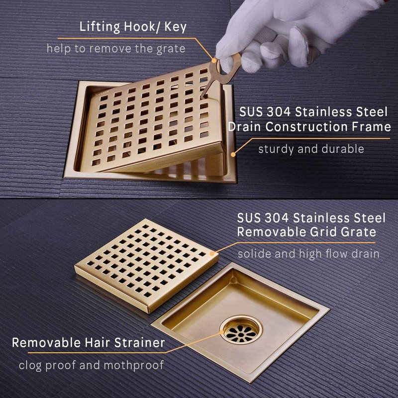 - Vibrant Brushed Gold Finish: awesome look, not easily to be scratched. This gold shower drainer matches your satin gold color/ champagne bronze/ antique brass gold faucets, shower heads and other bathroom fixtures accessories, and looks great with your tile