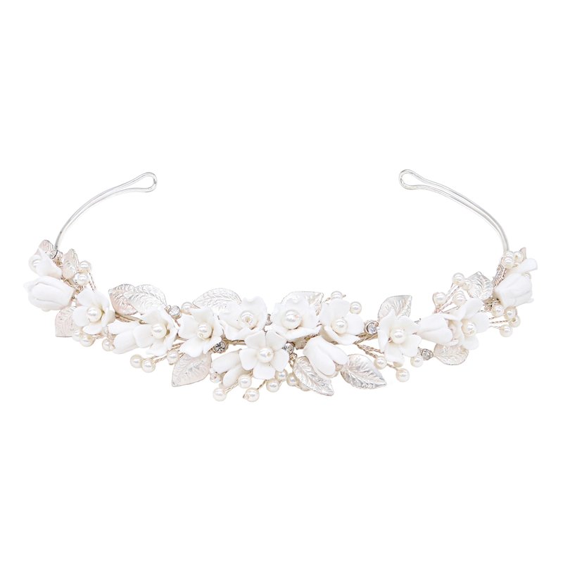 This bridal headband combines the natural beauty of ceramic flowers with the timeless elegance of pearls and the lustrous charm of metallic leaves, making it a perfect accessory to complete your bridal look with grace and style.