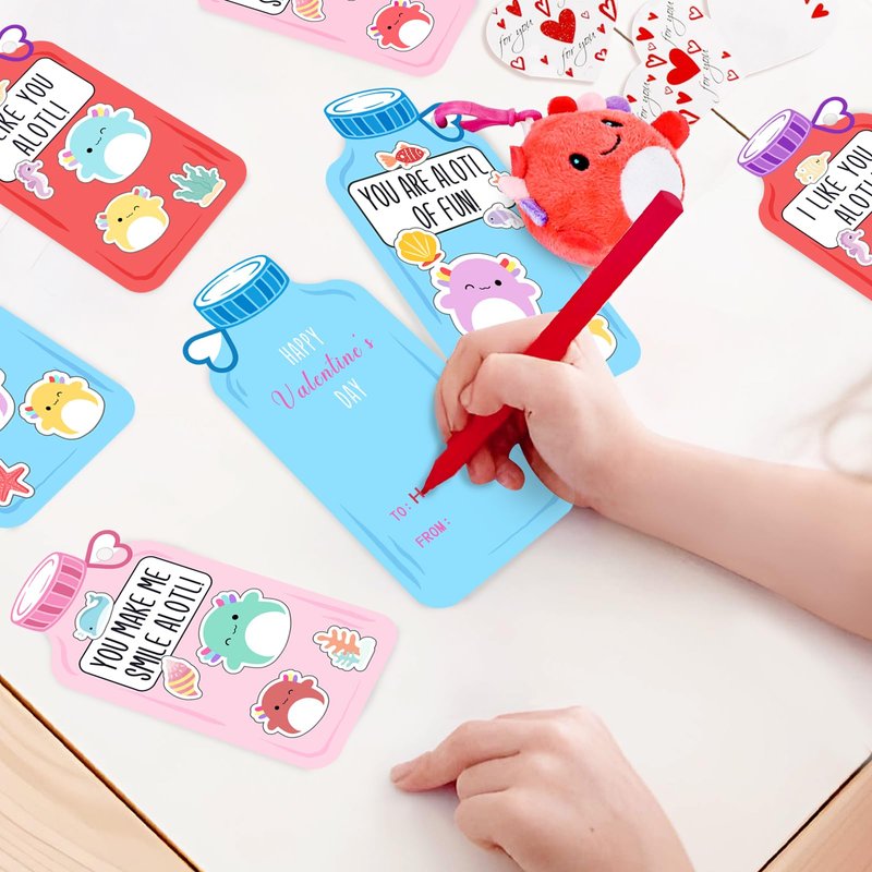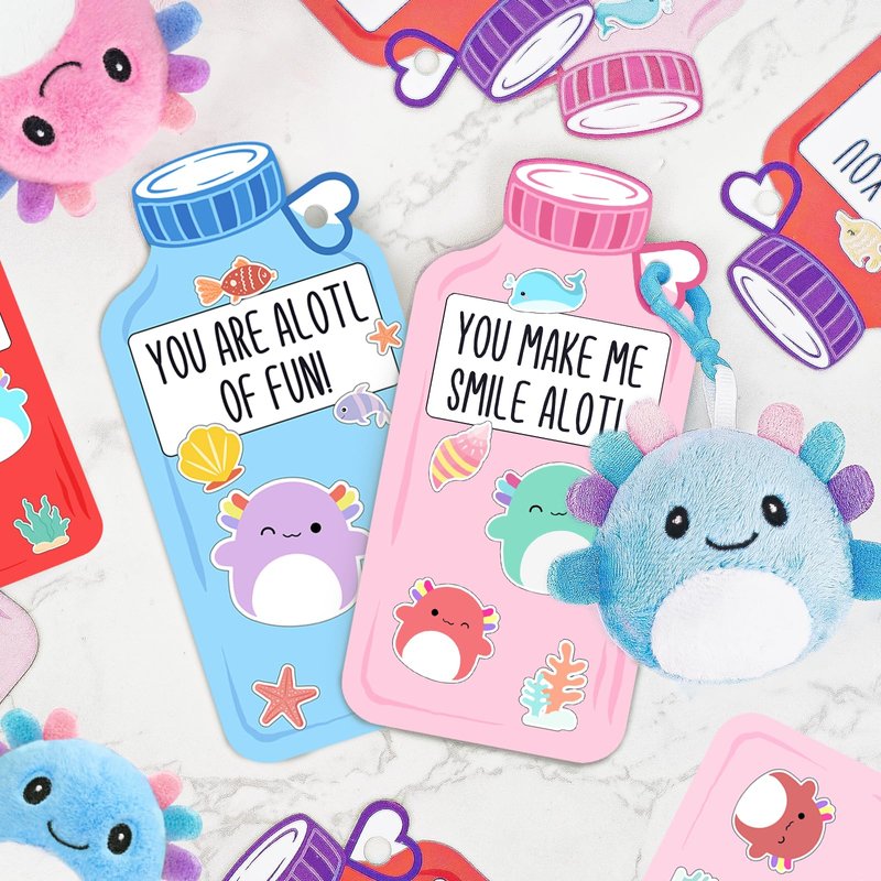 - Package includes 24 Valentine's Day cards and 24 Axolotl plush toys keychains (3 designs).