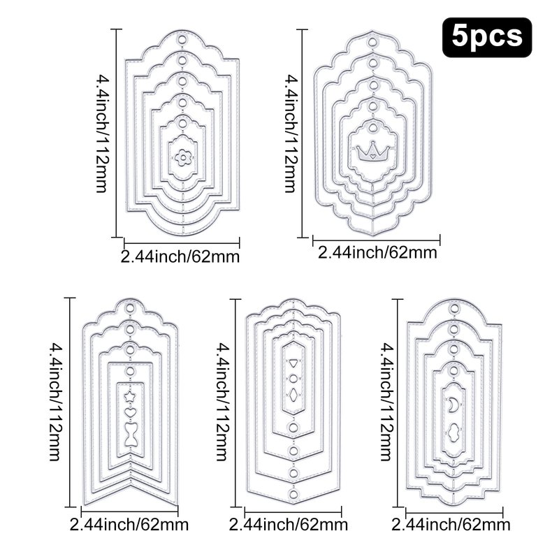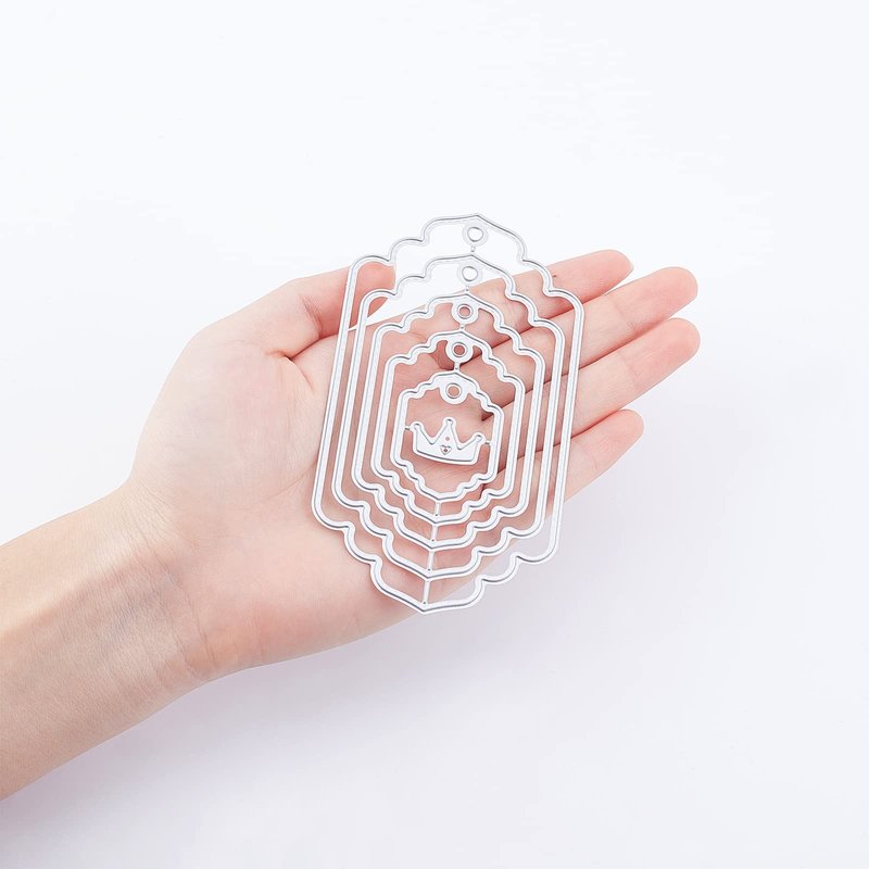 ORIGACH 5 Pack Tags Frame Die Cuts Specification: Material: Carbon Steel Color: Matte Platinum Quantity: 5 pack Feature Made of carbon steel material, good hardness and soft to touch. Best for making a beautiful greeting cards. DIY hand embossing help children's ability to develop intelligence. The great gift for your friends and children to clutivate their hands-on ability. Can Cut Multiple Materials Cleanly Can be used to cut through various materials, including paper, felt, cardstock, gummed flannel, laser paper, cotton cloth, etc!