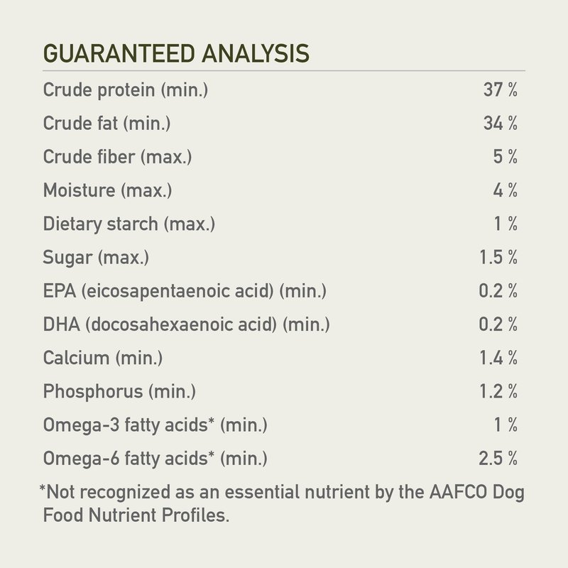 - Grain free** freeze dried dog food containing up to 90 percent quality animal ingredients*, including WholePrey ingredients like bones and organs to mimic what your dog's ancestors consumed in the wild