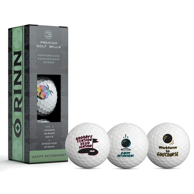 - Retirement Gifts for Golfers - Get their retirement into full swing with O'Rinn Golf's Fun Golf Balls! Stamped with a golfing paradise scene on one side and one of three hilarious messages on the other; "Goodbye tension hello pension", "Happy retirement" and "Workforce to golf course".