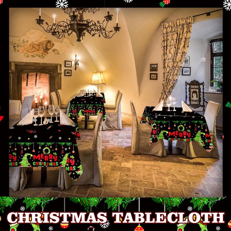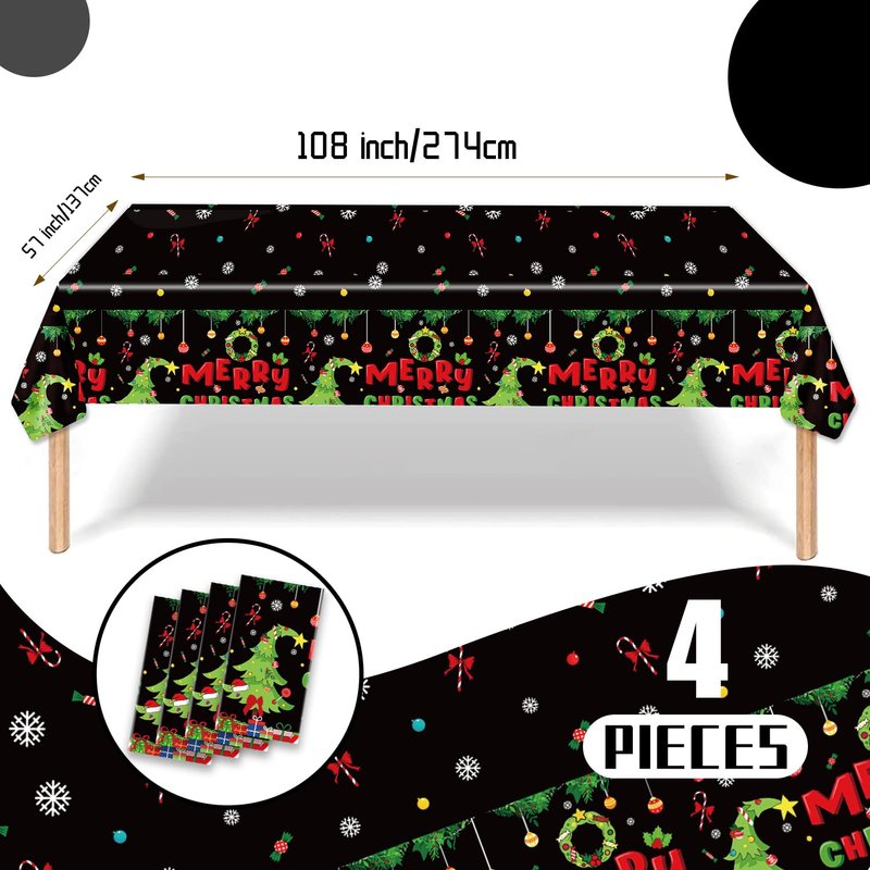 - Package Content - Each package contains 4pcs tablecloths. The 108 × 54 inch Christmas tablecloths are suitable for most tables, can be used indoors and outdoors as a decoration on the banquet table, and can also be cut into a larger size or used as a tablecloth.