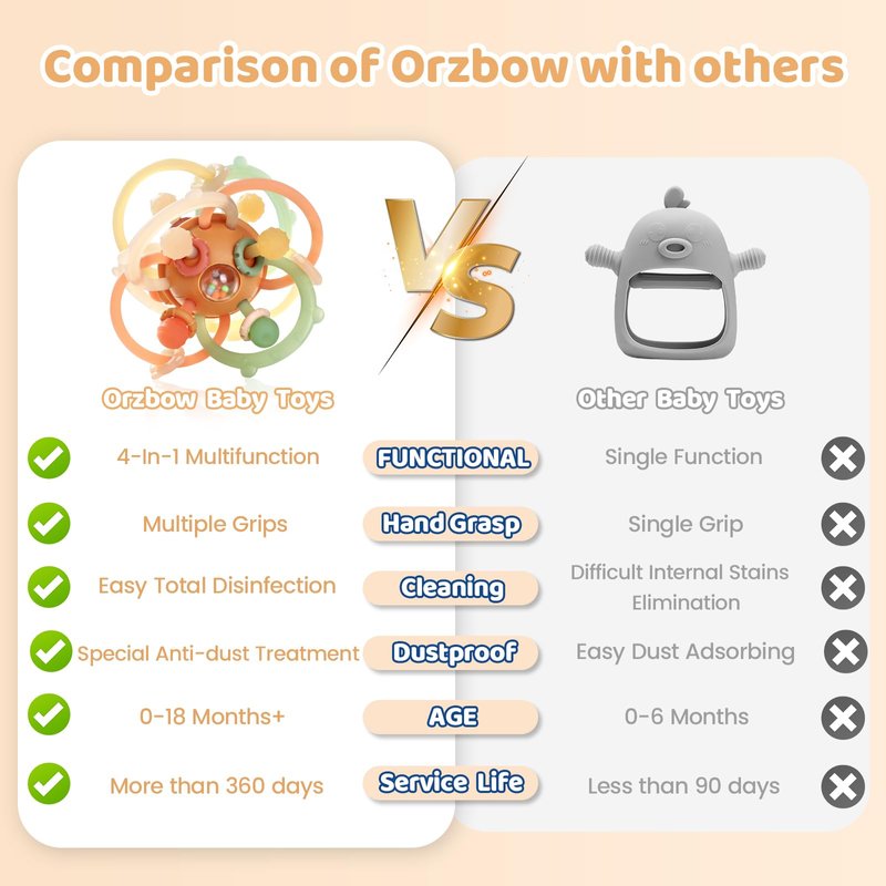 - ✅ 𝐒𝐀𝐅𝐄𝐓𝐘 𝐆𝐔𝐀𝐑𝐀𝐍𝐓𝐄𝐄: Made of 𝐁𝐏𝐀-𝐟𝐫𝐞𝐞, 𝐧𝐨𝐧-𝐭𝐨𝐱𝐢𝐜 and 𝐨𝐝𝐨𝐮𝐫𝐥𝐞𝐬𝐬 food-grade silicone, Orzbow Montessori Baby Toys has passed relevant 𝘀𝗮𝗳𝗲𝘁𝘆 𝗰𝗲𝗿𝘁𝗶𝗳𝗶𝗰𝗮𝘁𝗲𝘀 like 𝐂𝐄, 𝐂𝐏𝐂 and 𝐔𝐊𝐂𝐀, whose surface is treated with special anti-dust treatment, and irradiated by ultraviolet rays to reduce the adsorption of dust and hair, effectively reducing the frequency of cleaning and greatly improving the safety and convenience.