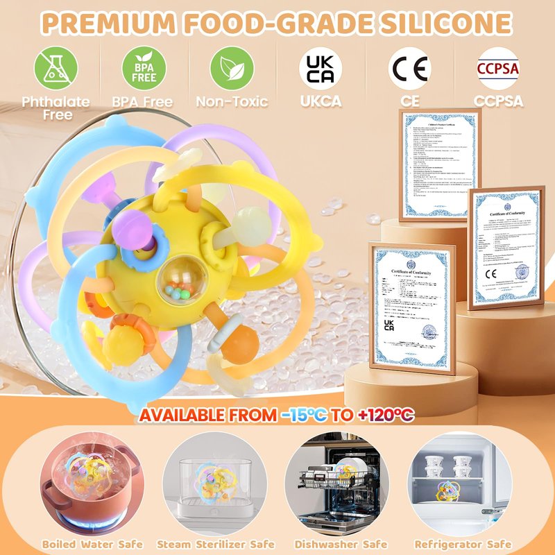 - 🍼 𝐑𝐄𝐋𝐈𝐄𝐕𝐈𝐍𝐆 𝐓𝐄𝐄𝐓𝐇𝐈𝐍𝐆 𝐃𝐈𝐒𝐂𝐎𝐌𝐅𝐎𝐑𝐓: Equipped with 8 colorful silicone balls with different textiles, Orzbow Teethers Toys for Babies can soothe and massage the gums well with different feelings, exercise the baby's ability to chew and bite and greatly provide fun, which is 𝐝𝐢𝐬𝐡𝐰𝐚𝐬𝐡𝐞𝐫 𝐚𝐧𝐝 𝐫𝐞𝐟𝐫𝐢𝐠𝐞𝐫𝐚𝐭𝐨𝐫 𝐬𝐚𝐟𝐞 (𝟱℉ 𝐭𝐨 𝟮𝟰𝟴℉), your ideal choice for 3-12 months baby's early development, making parenting easier.