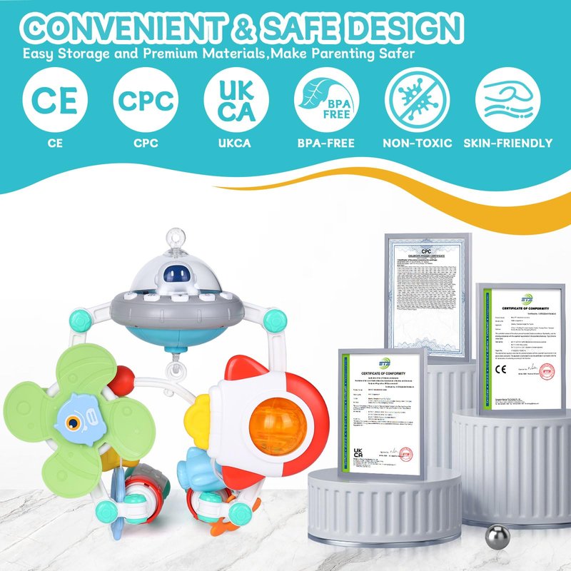 - SPACE-THEMED PLAY ARCH: Orzbow Baby Arch Stroller Toys boasts five playthings of alien spinning windmill toys, UFO motorized music box, rocket-shaped rattle teether, spinning pentagram and space shuttle toy.Cute design can captivate and delight babies