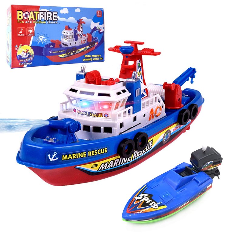 - The boat can flash red and blue lights and send out police siren, just like a tiny real fire boat.The water spout can move left and right,The hoist can swing up and down and right and left.