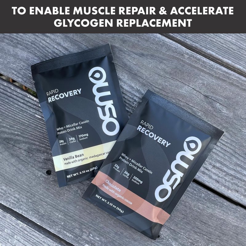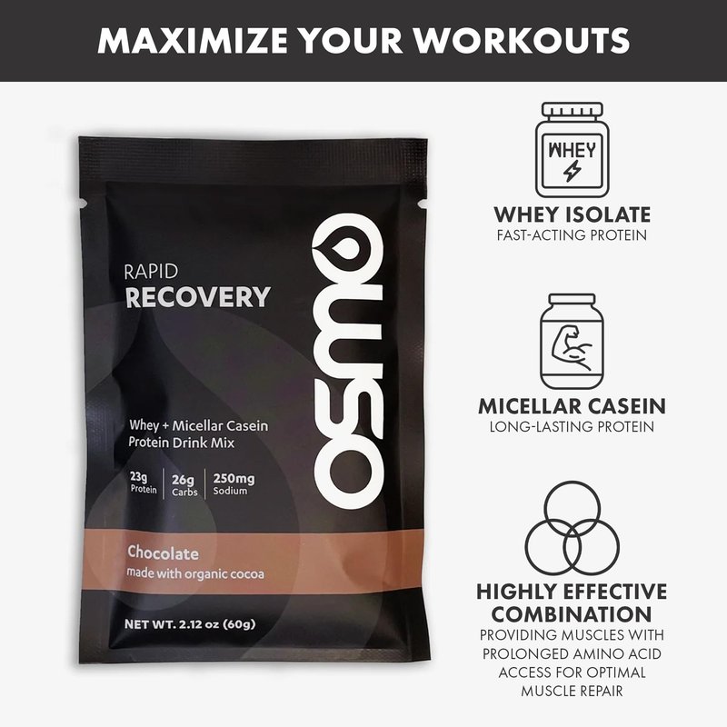 Osmo Rapid Recovery is designed to help your body recover rapidly and efficiently after a workout. With a unique combination of whey and casein protein, carbohydrates and caffeine, Rapid Recovery enables muscle repair and boosts glycogen replacement following a workout, helping you become stronger over time.