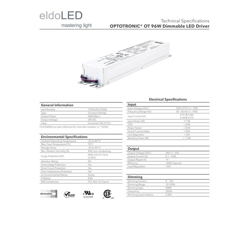 Osram 51520 Optotronic 96W 24V DC 120/277V AC 50/60Hz Constant Voltage Dimmable LED Driver OT 96W/24V/UNV/DIM