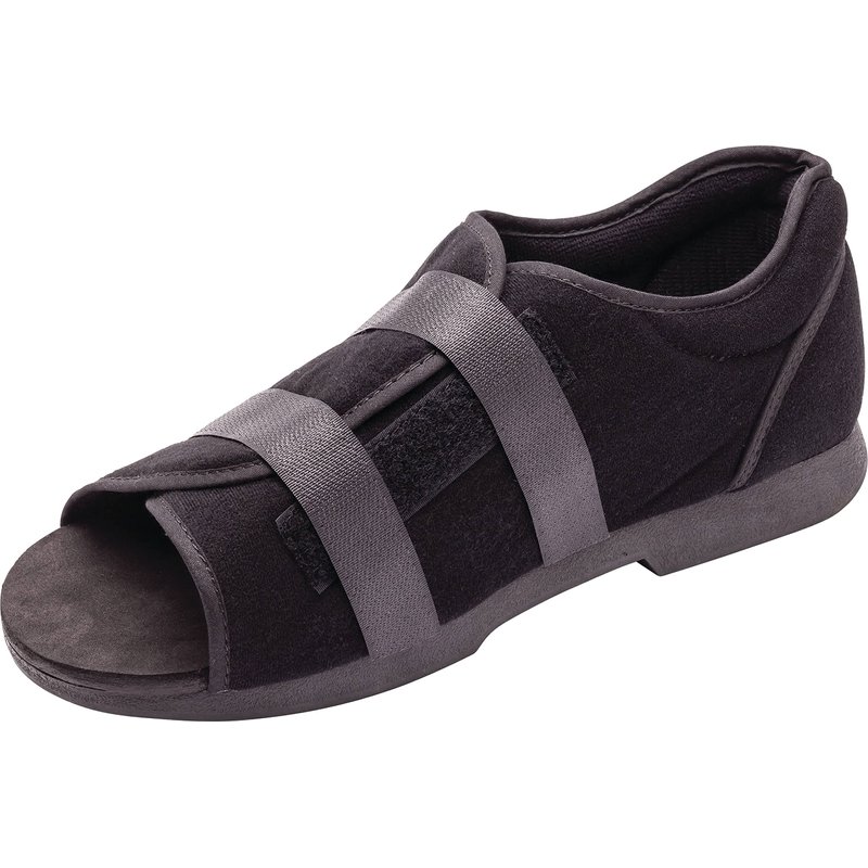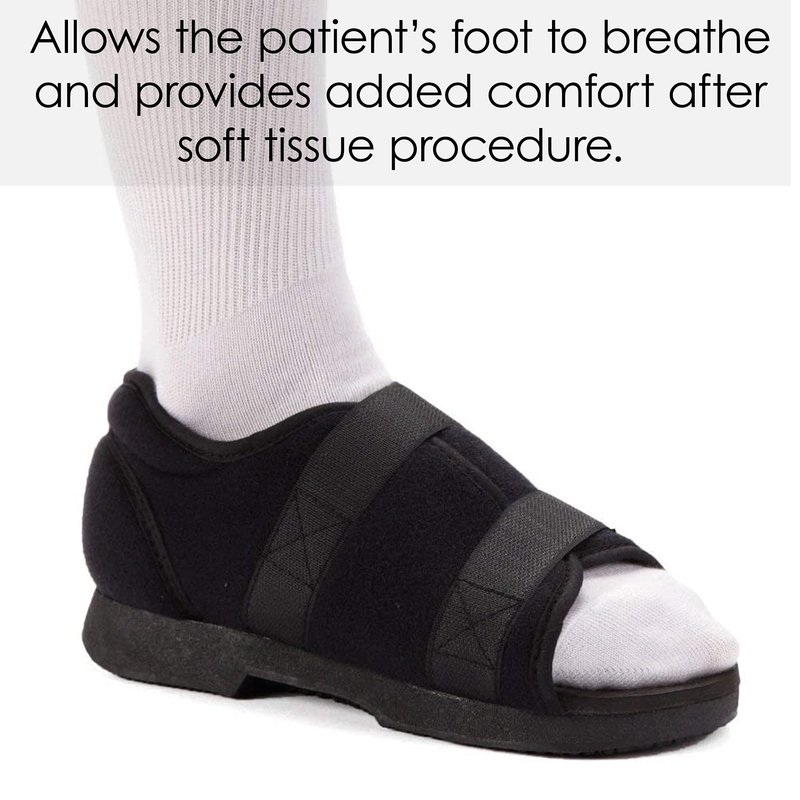 18005 Size: Medium, Gender: Women Features: -Soft top post-op shoe.-Available in men and women genders.-Cotton-poly blend upper allows the patient's foot to breathe and provides added comfort.-Designed specifically for recovery after soft tissue procedures, post trauma, or to relieve the geriatric or insensitive foot.-Contact closure system provides even torsion and is designed for ease of use.-Large size fit to 9'' - 11'' men's shoe and 9''+ women's shoe.-X-large fit to 11.5'' - 14'' men's shoe. Options: -Available in X-large, large, medium and small sizes. Dimensions: -Small size fit to 4'' - 6'' men's shoe and 5'' - 6'' women's shoe.-Medium size fit to 6.5 - 8.5'' men's shoe and 7'' - 8'' women's shoe. Warranty: -6 Months warranty.