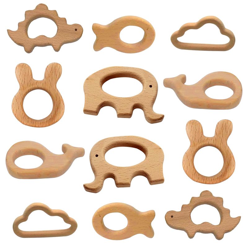 - Soothe your little one's teething discomfort with our 12Pcs Wooden Teethers for Babies. Crafted from natural wood, these baby toys provide gentle teething relief while encouraging sensory exploration and motor skills development. Let your baby explore the adorable wooden animal toys like elephant, rabbit head, big cloud, whale, fish, dinosaur!