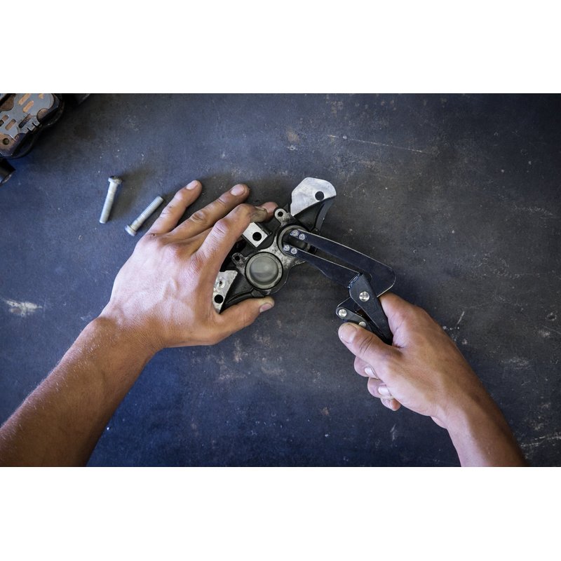 - Simply insert the uniquely shaped extensions on the pliers into the pistons then squeeze the handles on the pliers to lock them into place.