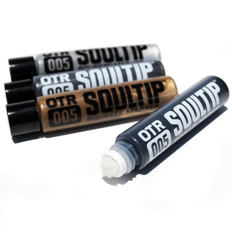 On The Run now offers their extremely popular OTR.005 Soultip squeeze marker in a ready to go version, prefilled with 30ml of their world famous Soultip Paint. The OTR.005 Soultip marker is a smaller and more portable version of the traditional mop, and is widely considered the best dauber available on the market. The durable 12mm Mohair "Diamond-Fibre" nib is resistant to abrasion and the body of the marker is made with a soft plastic for superior flow control. This high-glossy super permanent paint has a highly opaque coverage thanks to strong enrichment with pigments. Soultip paint is also weather proof.