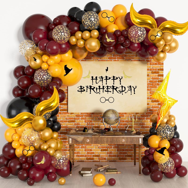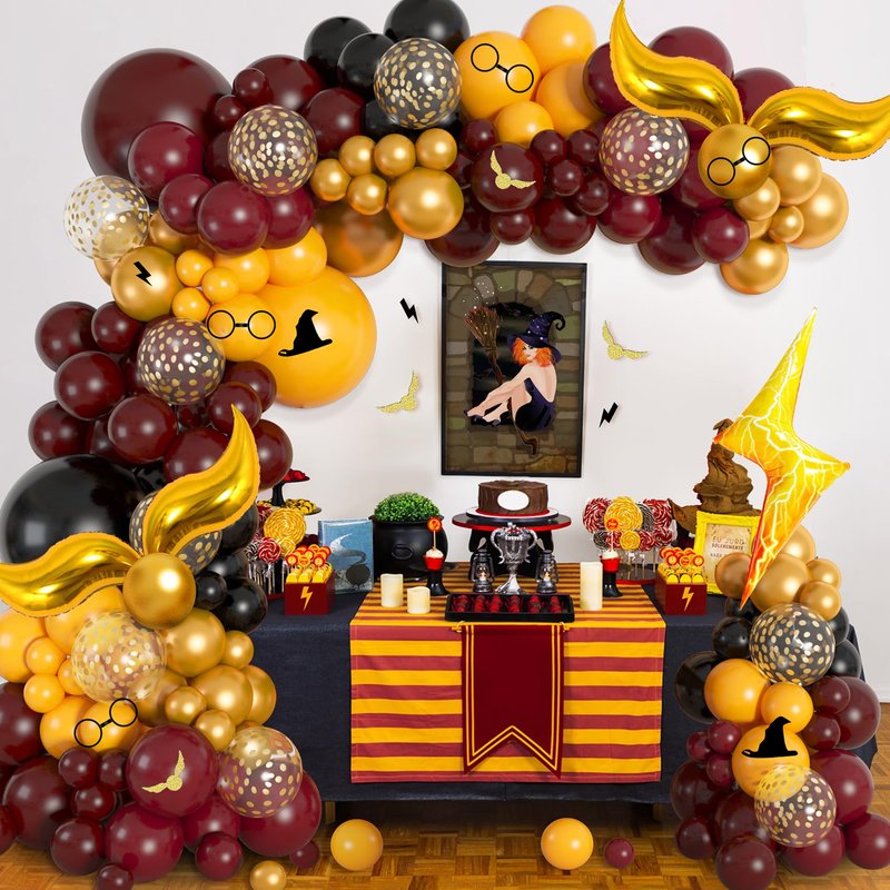 - Easy to Assemble: The magic wizard school balloon arch is very easy to assemble, just inflate the balloon and put the balloon into the hole of the arch strip. This magic wizard school party decoration provide tools to help you quickly form a balloon arch. Using balloon glue can easily fill the gaps in balloons with smaller balloons. You can hang burgundy and gold balloons on trees, walls, windows, doorways, dining tables, and so on.
