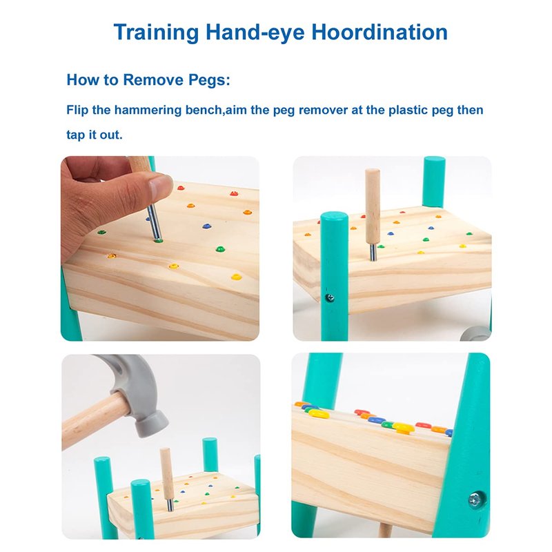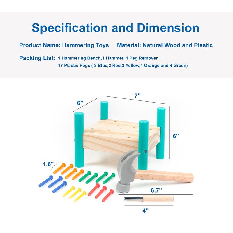 - 【WAY OF PLAYING】Hammering is fun! This toy is double sided,Insert the plastic pegs into the holes of the hammering bench then tap it with a hammer.Flip the hammering bench,aim the pegs remover at the plastic pegs then tap it out and start again, it’s that easy and real.Your little one will have hours of fun playing with this hammering toy.