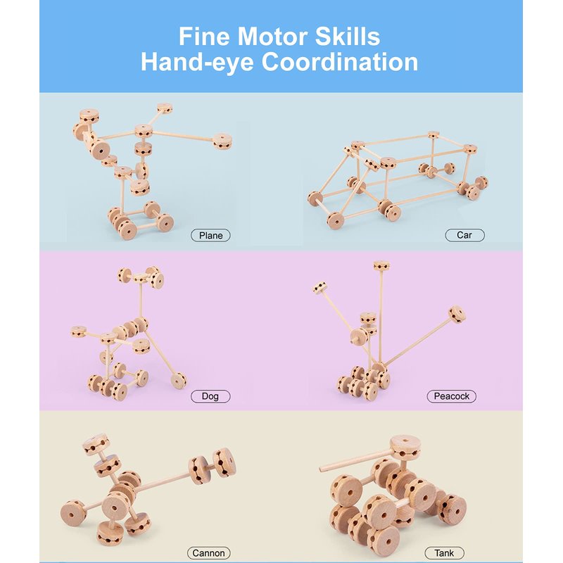 - 【WHAT YOU GET】40 pcs rods of different lengths and 20 pcs round joints, 1* barrel box, 1* Instructions. Assembly Tips: The rods was made of soft lumber,they are a bit tight in the early of use,rotating insertion will be easier. Kids can build all kinds of shapes follow his/her imagination like house, animal,car, tank,airplane,12 constellations puzzles,etc.