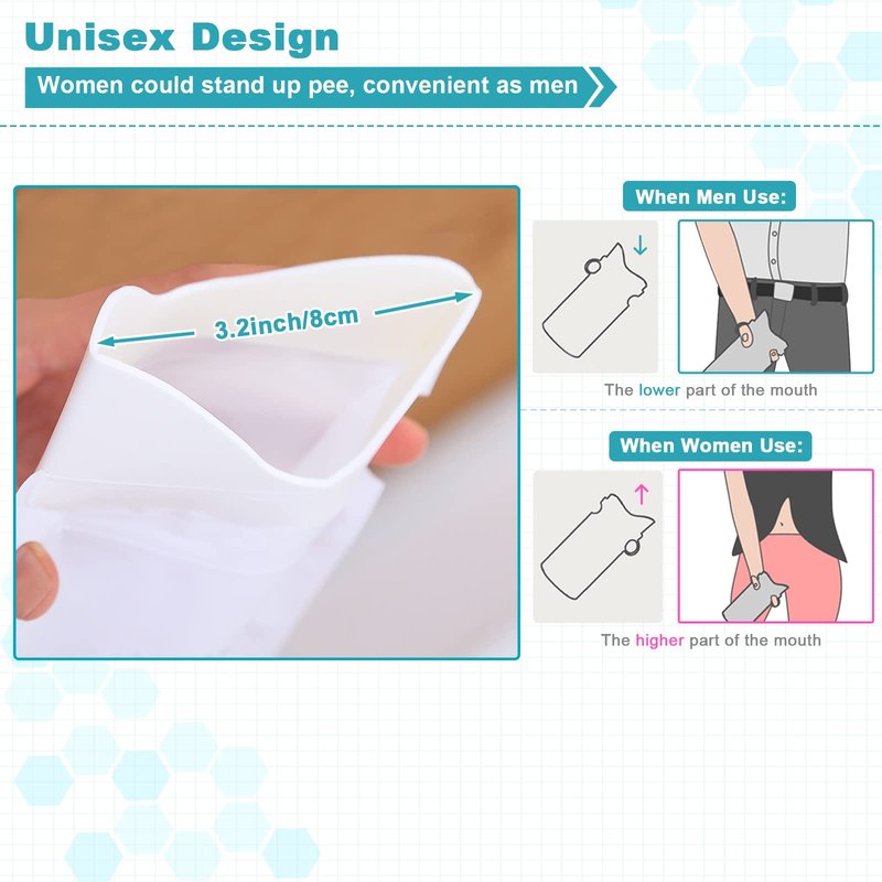 - 🌊Large Capacity & Unisex Design - These disposable urinal bags with a capacity of 700 ml, you can even use it 2xs or until its full. They are unisex design for Men Women Kids Children Patient to use, women could standing up pee this female urinal, convenient as men.
