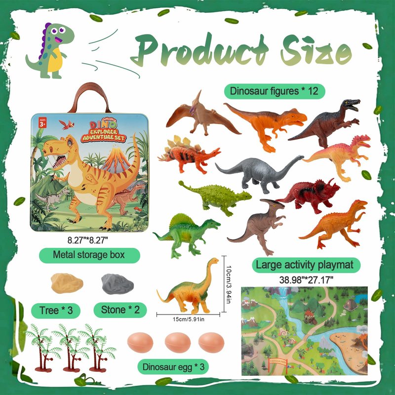 - Valuable Pack: Ignite your child's imagination with this dinosaur play set. This comprehensive realistic dinosaur figures include fan-favorites like T-rex and Stegosaurus, alongside large dinosaur park activity play mat, trees, dinosaur eggs and stones in a metal storage box. This toy dinosaur set offers an immersive experience, allowing kids to create and enact their own adventures.
