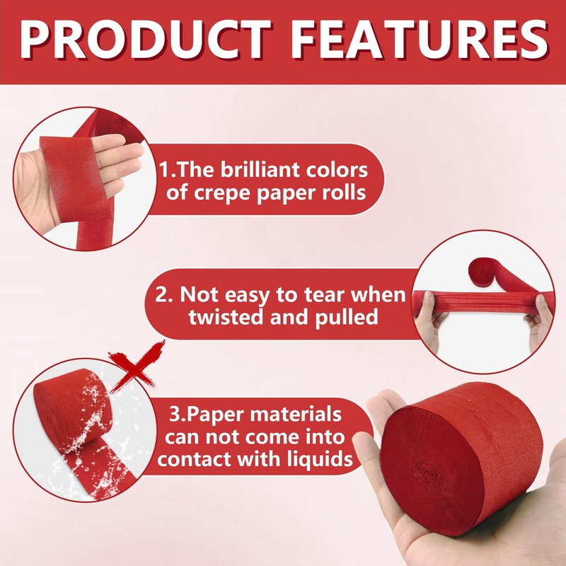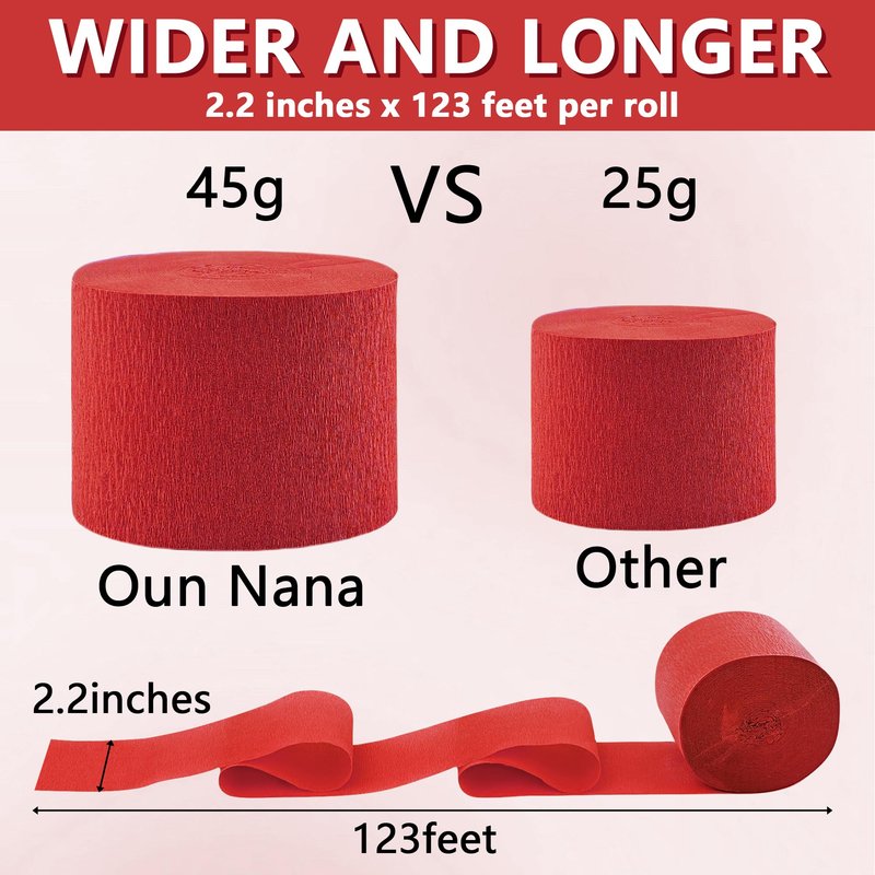 - Wider and Longer Per Roll: In order to meet the needs of more party scene decorations, we have produced wider and longer crepe paper streamers. The width of each roll is 2.2 inches and the length is 123 feet. There are 6 rolls in the package, which are enough for one party decoration