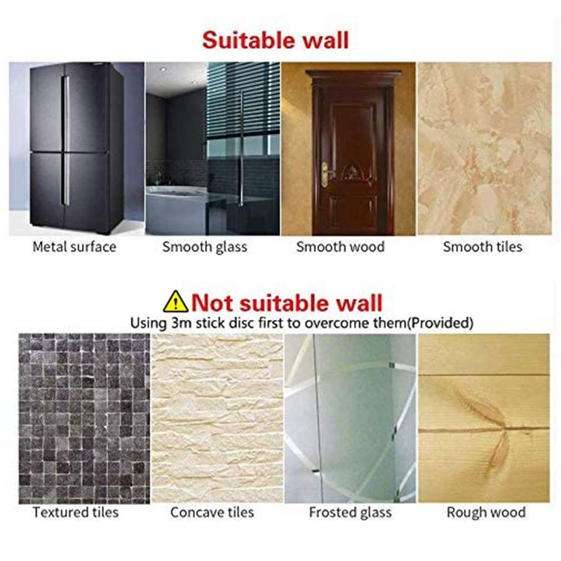 - Vacuum Adsorption Principle: 🌟3M stickers are recommended for all walls (3M stickers available). Make sure contact surfaces are clean before use. Super strong suction cup sucker which diameter is large 2.8-inches,good air tightness of the silicone material, suitable for Metal surface, Smooth glass, Smooth wood, Smooth tile. But not suitable for textured tiles, concave tiles, frosted glass, rough wood.