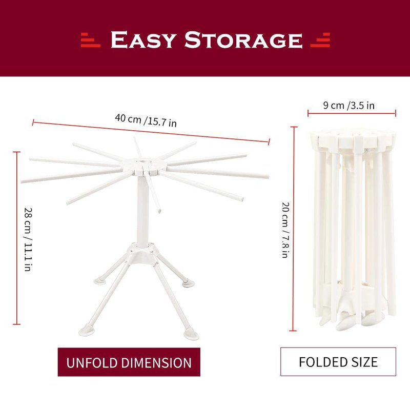 - ◑ COLLAPSIBLE PASTA HANGER: 10 hanging arms and 4 feet are very easy to fold down flat for convenient storage. The folded size is 7.8 inches in height and 3.5 inches in width.It won’t take up a lot of space in your kitchen. It is an ideal necessity for small kitchens and RVS.