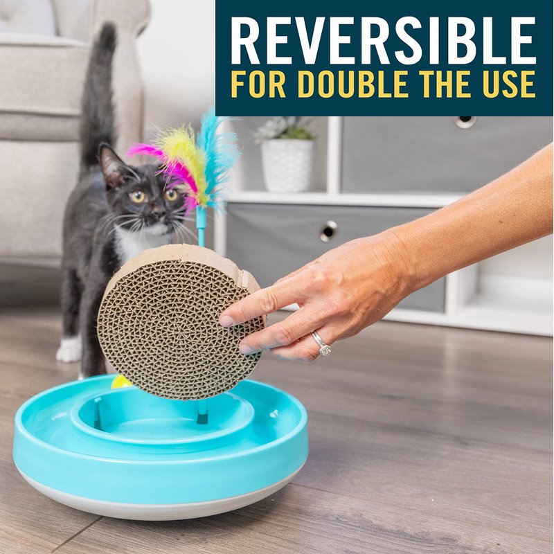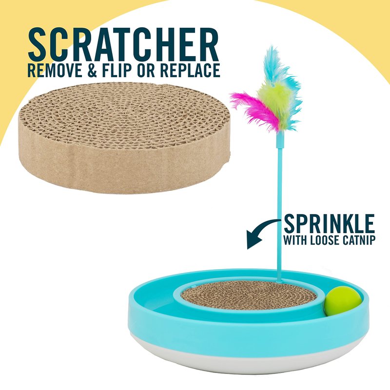 - ENCOURAGES POSITIVE PLAY: The OurPets Wobble Scratch Track is a 2 in 1 Toy. The base wobbles while the balls spin erratically, mimicking a bird in flight engaging your cat's natural hunting instincts. Comes with removeable feather wand & replaceable cat scratcher offering a full play station for cats and kittens.