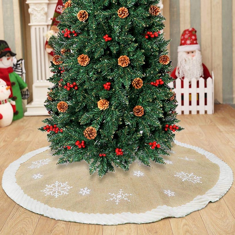 - ★ Our countryside tree skirt is 100% high quality Jute burlap with classic white gitter snowflakes, perfect for winter Christmas tree decor, brings more joyful atmosphere to the holiday and show your unique tastes