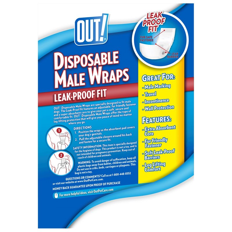 - NO MESS - OUT. PetCare Disposable Male Wraps provide protection for urinary incontinence, male marking, excitable urination and travel. For female dogs, try OUT. PetCare Disposable Dog Diapers.
