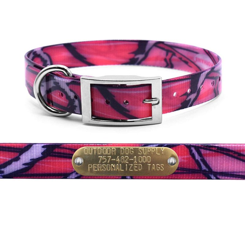 Outdoor Dog Supply's 1" Wide Pattern D Ring Dog Collar Strap with Custom Brass Name Plate (21" Long, Pink Camo)