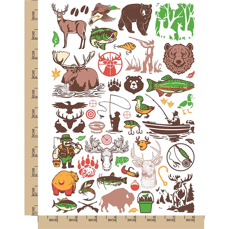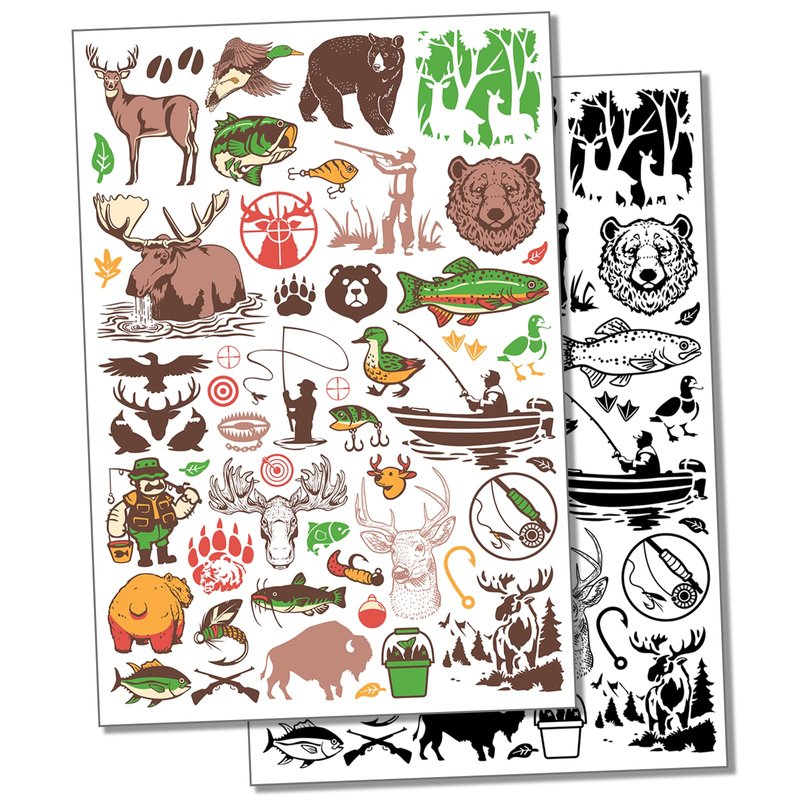 Outdoors Animals Hunting and Fishing Temporary Tattoo Water Resistant Fake Body Art Set Collection - Color (One Sheet)