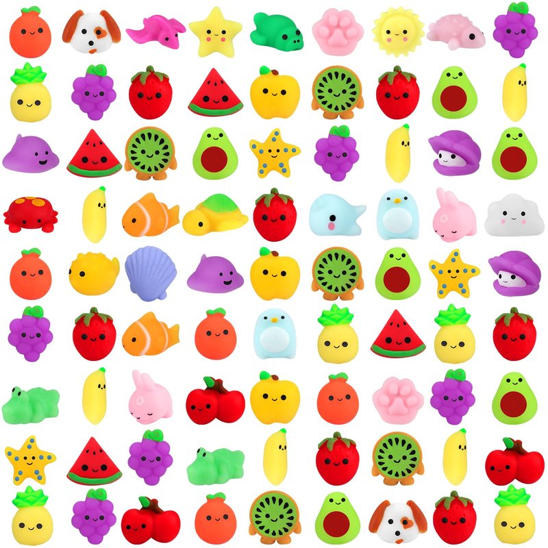 - PACKAGE INCLUDED - 100 pieces mochi toys for fruit, sea animals, dinosaur and other type with a beautiful box, including cat, rabbit, bird, monkey, dinosaur, seal, watermelon, strawberry, pineapple and etc. Size about 5cm/1.9inch. Each stress relief toy has an individual package, bulk toys are very cute and small. You can put it in your pocket and carry easily.