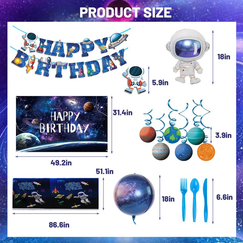 - 🎁Outer Space Party Decorations Includes:1*happy birthday banner, 48*10’’balloons,1*cake topper, 24*cupcake toppers , 20*napkins, 10*knives, 10*forks, 10*spoon, 10*7’’plates, 10*9’’plates, 10*cup, 1*tablecloth,1* backdrop,2*planet foil balloons,3*star balloons.