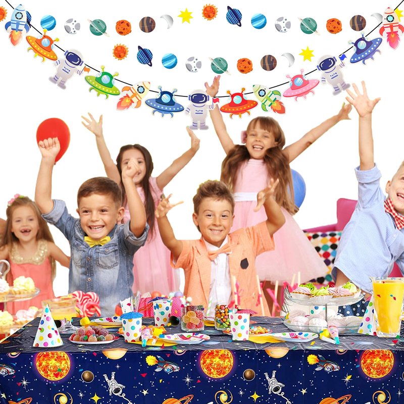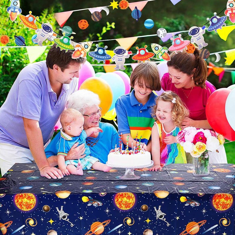 - Complete Space Theme Set: Bring the wonders of the galaxy to your next party with our Outer Space Birthday Party Decorations set, including a space tablecloth, space banner, happy birthday banner, and planet banner.