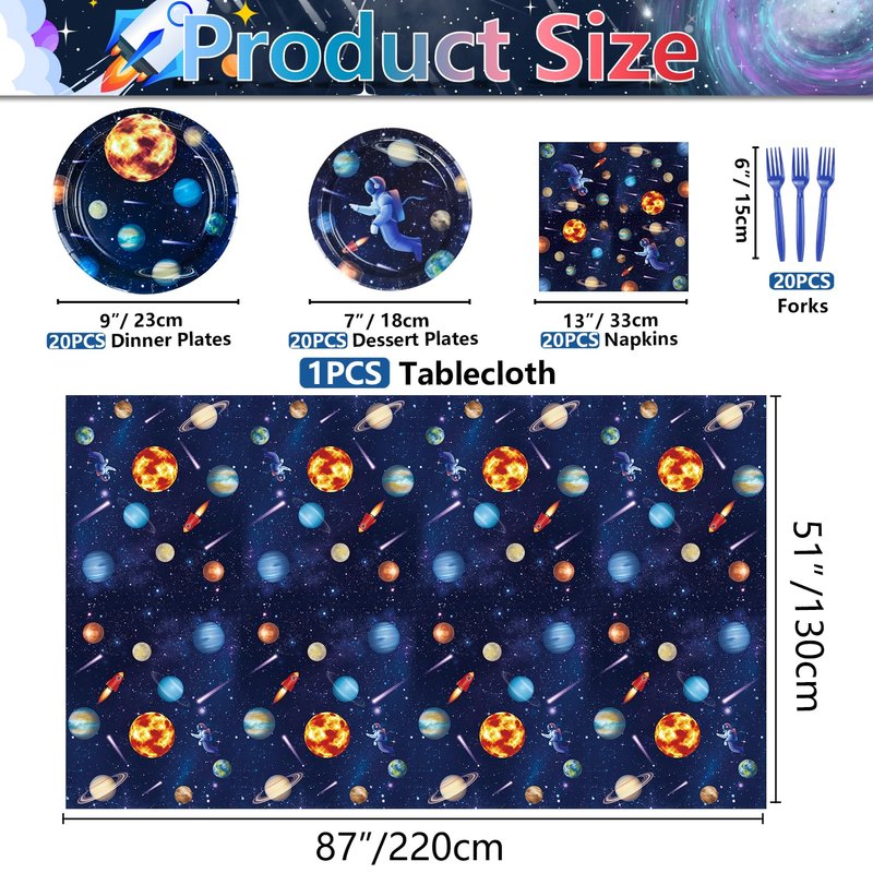 - 【Outer Space Party Supplies】Package includes 20 x 9’’ dinner plates, 20 x 7’’ dessert plates, 20 x napkins, 20 x forks, 1 x outer space tablecloth.