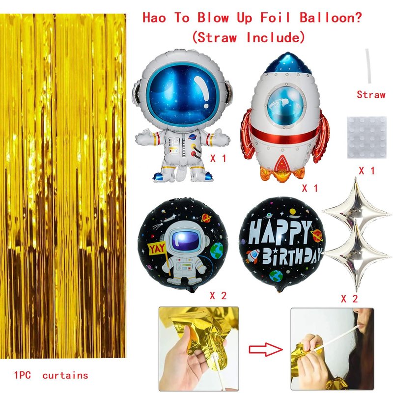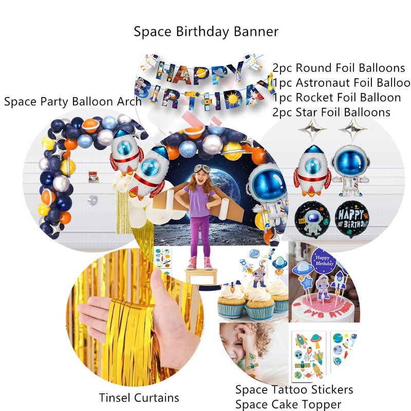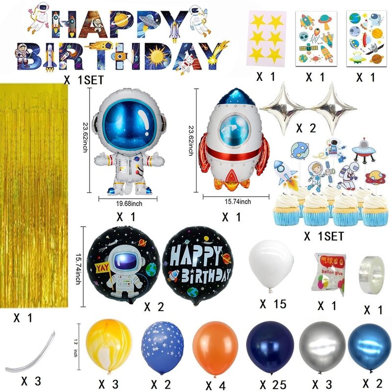 - [Great Value Pack:]:What would you get? You will receive 1pc happy birthday banner, 7pc cake toppers, 57pc latex balloons, 2pc round astronaut foil balloons, 1pc astronaut foil balloon, 1pc rocket foil balloon, 2pc star foil balloons, 1pc 1*1m tinsel curtains, 2pc outer space tattoo stickers, 1pc star sticker, 1pc balloon garland strip, 1pc glue dot.