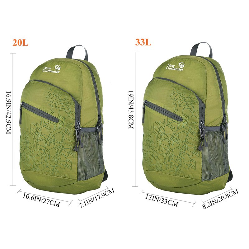 About Outlander Packable Backpack With a stylish look, this packable go-anywhere pack is for super-minimalists who make every gram count. Ultra-light. Ultra-durable. Ultra-awesome. The backpack is perfect for day-to-day use or occasional travel. Adjustable breathable straps make it easy and comfortable to carry for all day use. COMPACT. Folds into zippered inner pocket to fit anywhere. Unfolds from pocket to backpack. Must have on every trip. MULTI COMPARTMENTS. Features a classic shape with several pockets for storage and organization. This backpack has a roomy main compartment, two front zipper pockets to hold small accessories, one internal security zippered pocket for valuable items and two side pockets for water bottle or umbrella. LIGHTWEIGHT(0.46 Pounds/0.5 Pounds) and ROOMY(20 Liters/33 Liters). A true space saver. Stuff the bag into its own pocket for storage---no extra fees, and unzip it when you reach your destination. Avoid overweight charges, simply unfold from your luggage and use it as a carry on for your excess baggage. DURABLE. The backpack is made from highly rip and water resistant nylon fabric, provide strengthen and long-lasting performance with minimal weight. Stress points are reinforced with bar tacking for increased longevity. Durable 2-way Abrasion Resistant SBS Metal Zipper across the backpack. Dimensions: 20L: Unfold: 16.92x10.63x7.08 inches, Fold: 6.29x5.90x1.97 inches Dimensions: 33L: Unfold: 19x13x8.2 inches, Fold: 6.29x5.90x2 inches. Warranty: Our Promise-Lifetime Warranty-Exchange, return, whatever it takes. Ultra-light. Ultra-durable. Ultra-awesome. The backpack is perfect for day-to-day use or occasional travel, and great gift for everyone.