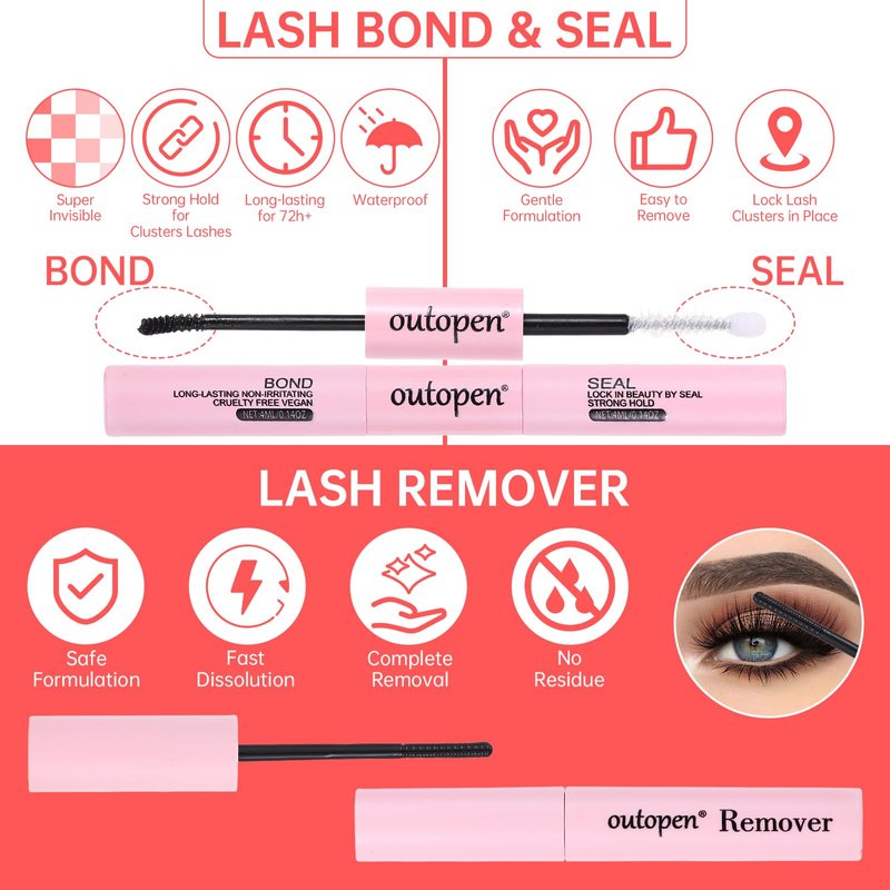 - 【Long-Lasting Hold & Easy to Remove】: Lash Bond and Seal 2 in 1, one side is lash bond and the other side is lash seal, which can effectively improve the adhesion of lash bond and seal eyelash glue to keep eyelashes longer up to 72 hours; For removal, easily remove bond and clusters without residue with lash remover