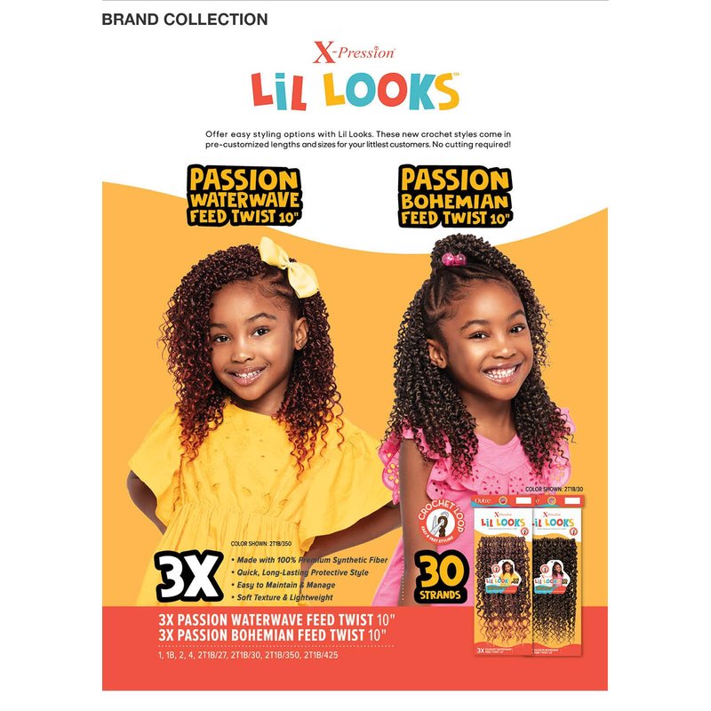 X-Pression Lil Looks creates long-lasting, kid-friendly crochet styles for your little cutie. Our crochet pieces are the perfect size – not too long or too full, and made with resilient fibers that maintain a neat look longer. Easy to install and comfortable to wear – X-Pression Lil Looks is the styling solution that makes everyone happy.