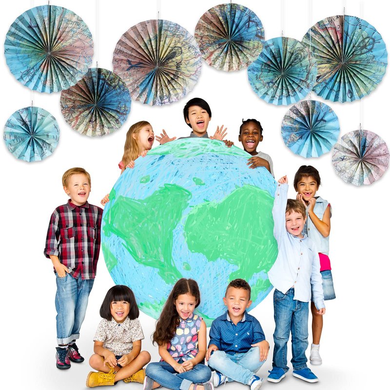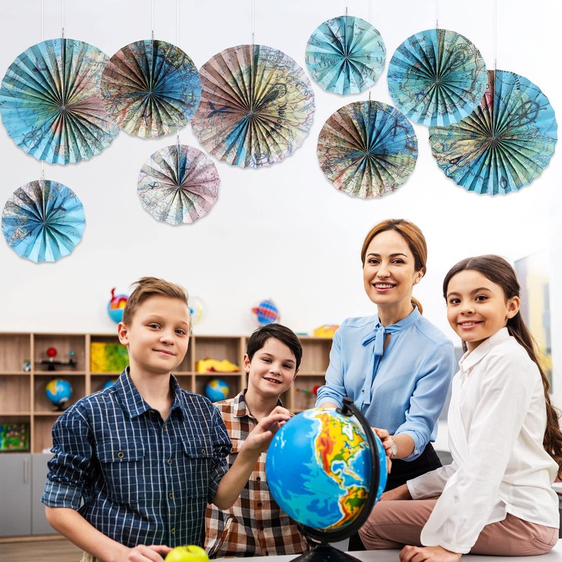 - Appropriate Fans Size: there are 3 different sizes of map theme hanging paper fans classroom decorations for you to choose, about 8 inches, 12 inches, 16 inches, 6 pieces in each size, the proper size will match well with other classroom party supplies